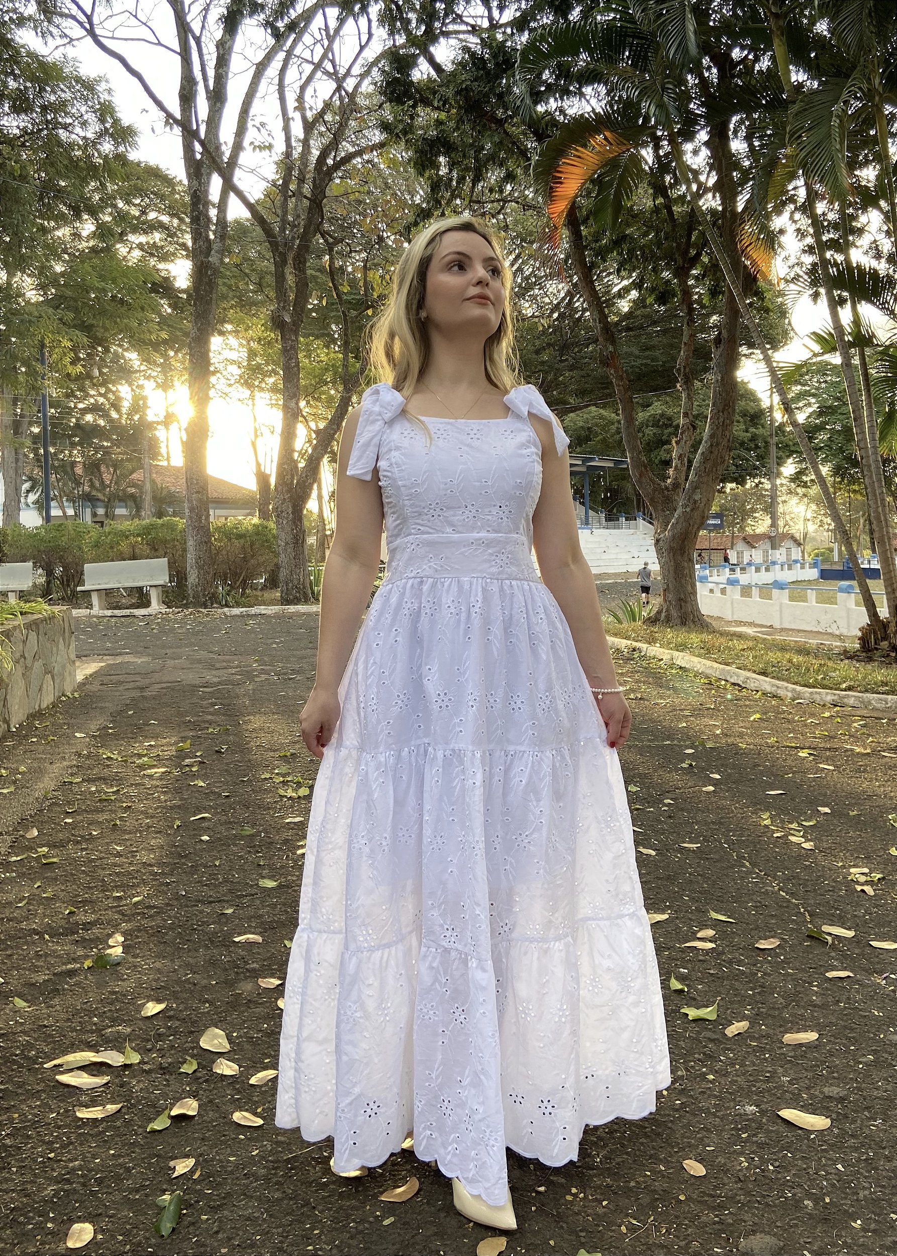 Romântico e elegante, este vestido em laise branca bordada com delicados florais combina charme e leveza em cada detalhe. As alças ajustáveis, que se amarram nos ombros formando charmosos laços, trazem um toque de feminilidade à peça. O corpete com costas em lastex garante conforto e caimento perfeito, enquanto a saia em três Marias adiciona movimento suave e refinado. Com forro na parte frontal do corpete e na saia, o vestido oferece um acabamento impecável, ideal para eventos ao ar livre, brunches e momentos especiais.